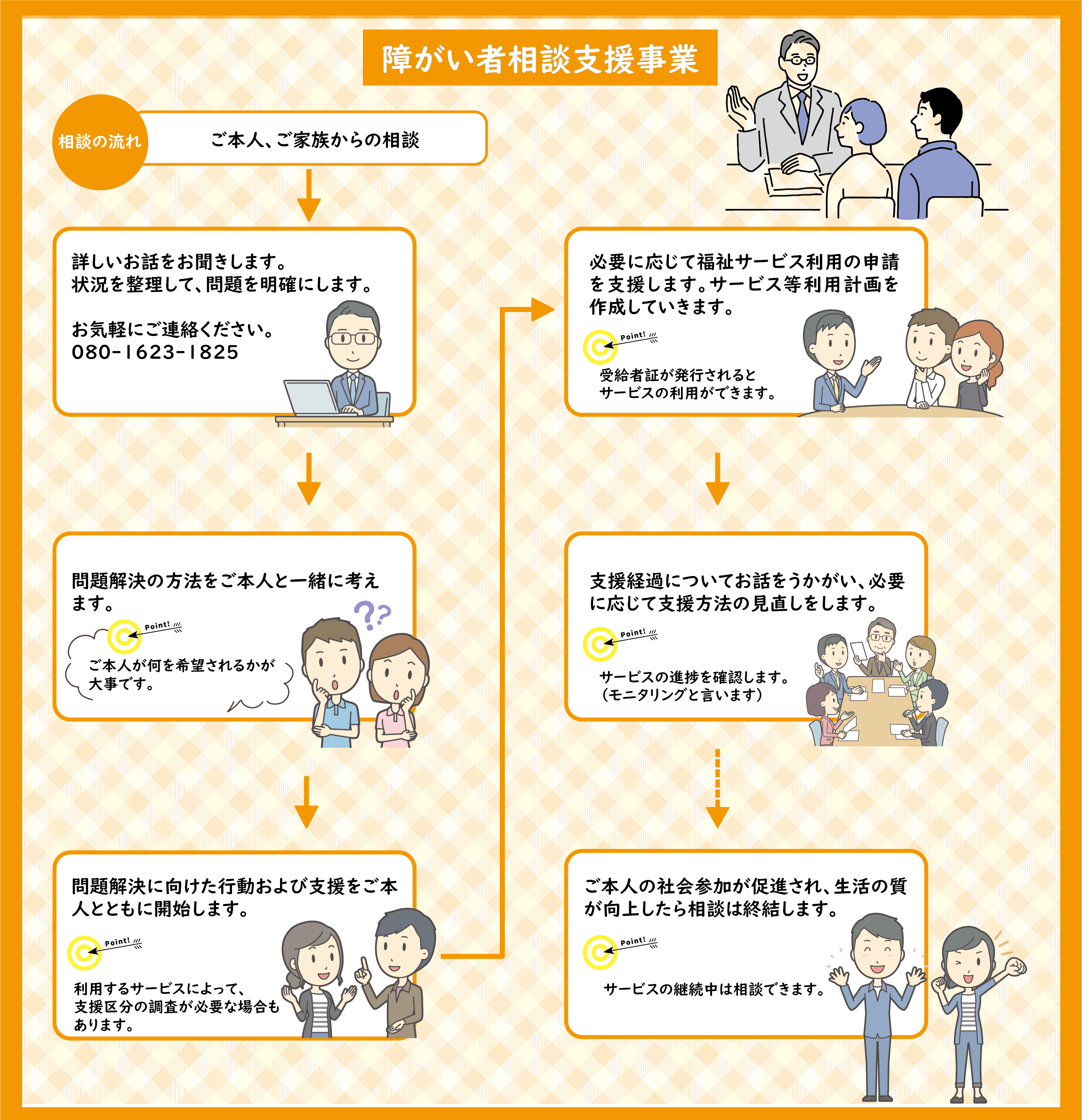 行政や医療機関、社会福祉協議会、障がい福祉サービス事業所の他、民生委員・児童委員やボランティアなど、地域の様々な機関とのネットワークを活用して、障がいのある方の生活の質が向上するよう支援いたします。